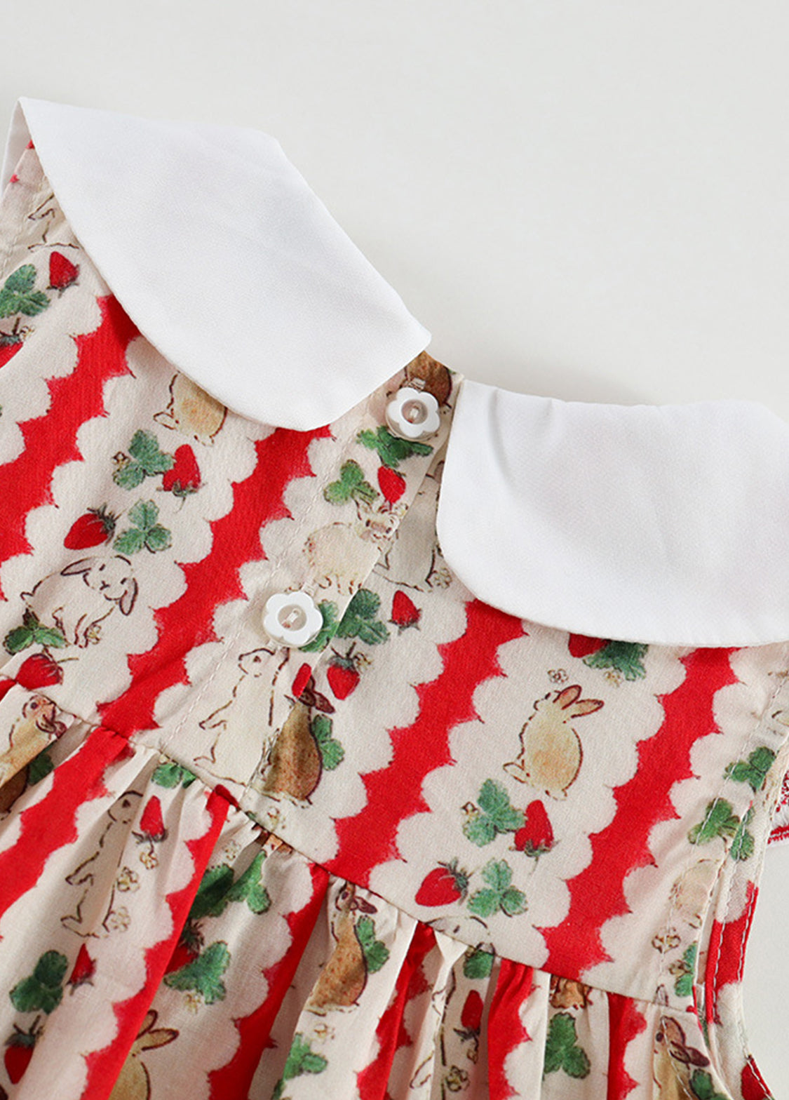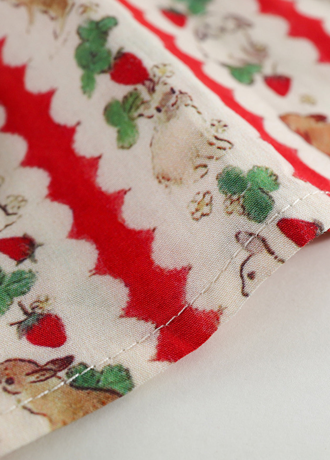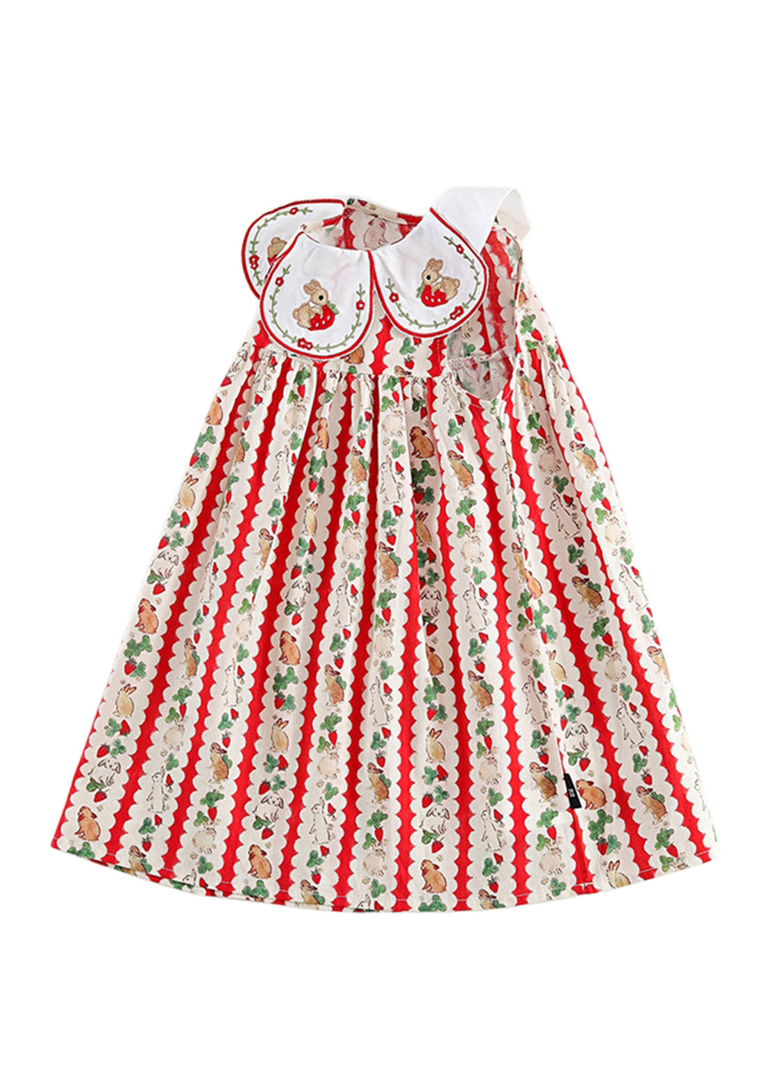 This dress is made of soft and breathable pure cotton, offering a comfortable feel against the skin. The red and white striped background is adorned with cute rabbit, strawberry, and carrot prints. Embroidered rabbits and flowers on the petal collar add a touch of sophistication, while the pleated details give the dress a lively and dynamic feel. The overall style is sweet and playful, blending retro pastoral charm with fairytale elements, making it suitable for everyday wear, Easter, picnics, family gatherings, and various other joyful occasions.