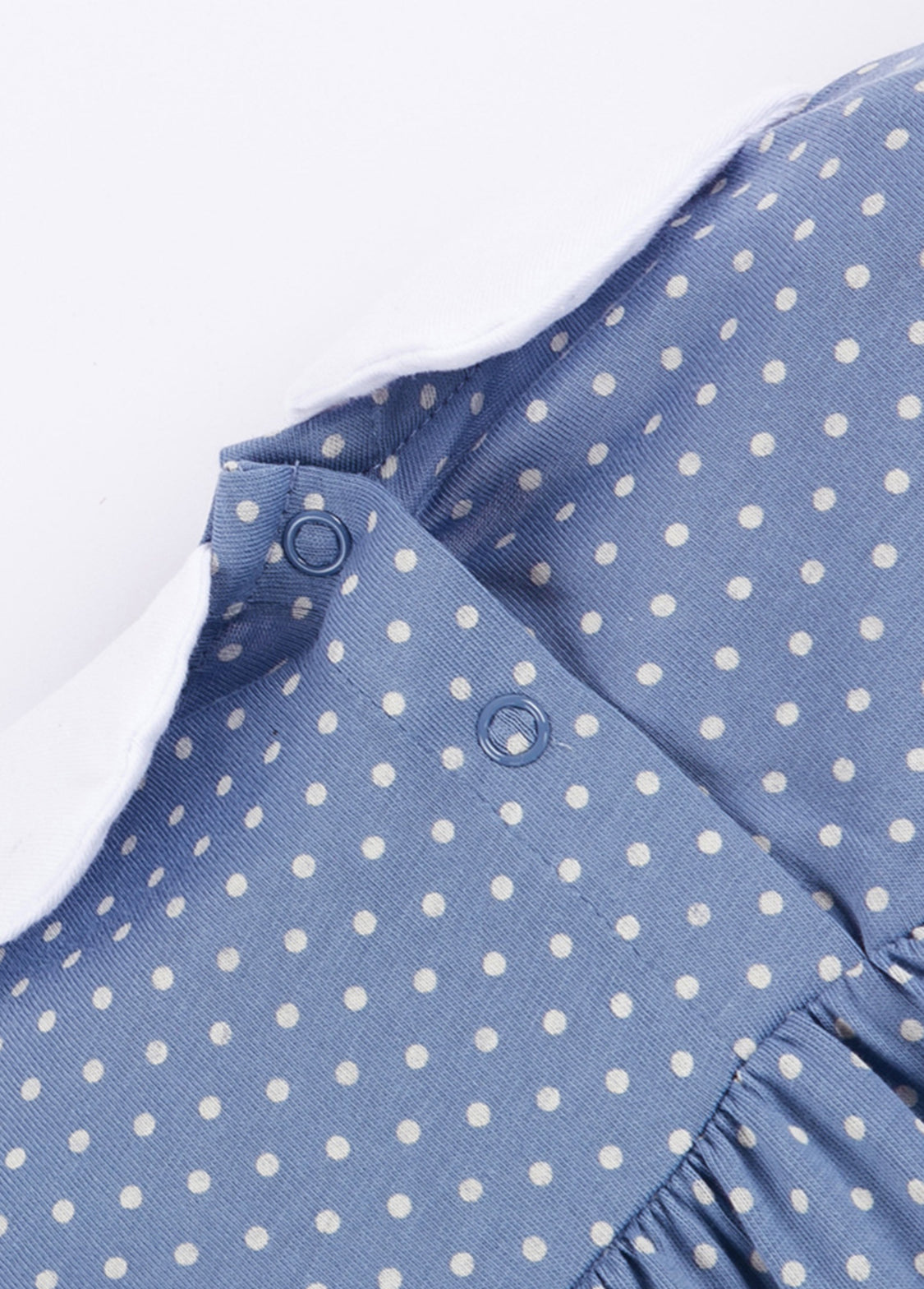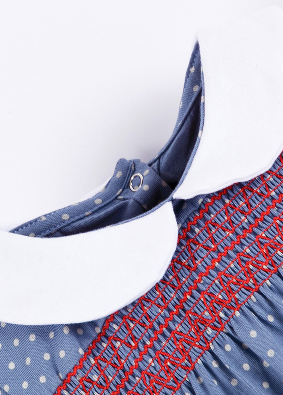 Made from soft, breathable cotton, this dress features a retro blue background with white polka dots, a classic white Peter Pan collar with red pleats at the chest, and playful embroidered rabbits and mushrooms at the hem. The overall style blends British retro charm with sweet, childlike appeal, making it perfect for cozy occasions such as spring picnics, family gatherings, or kindergarten activities.