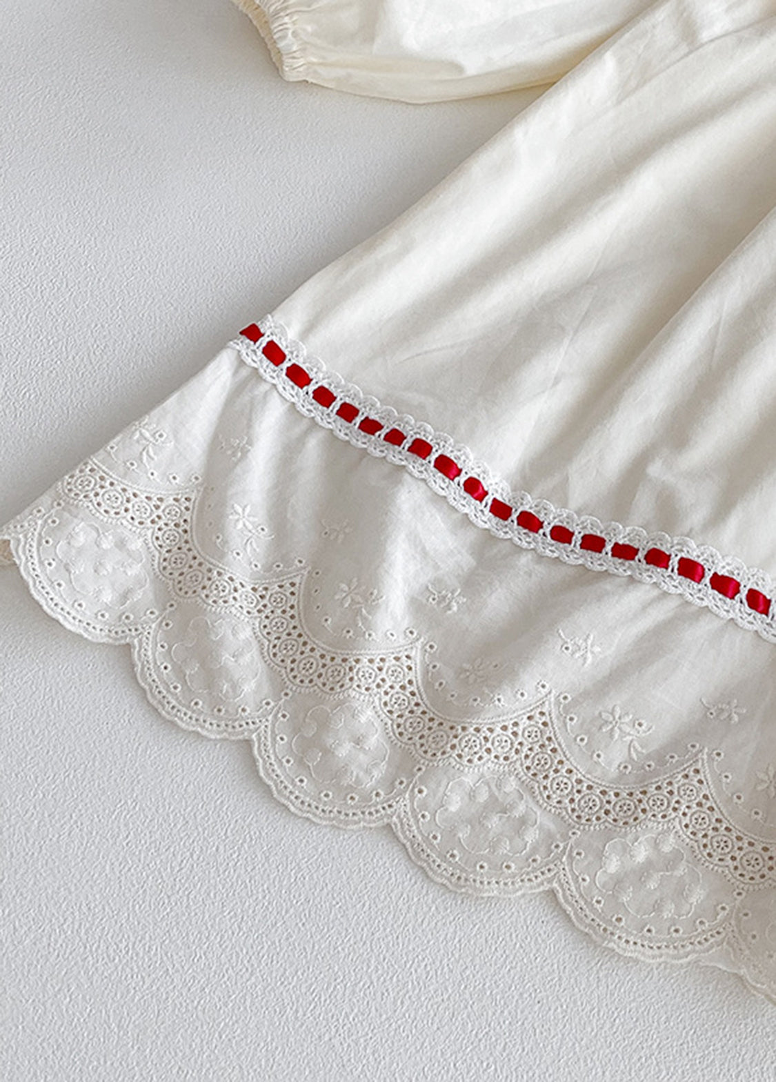 Design: Print, openwork embroidery, ruffles