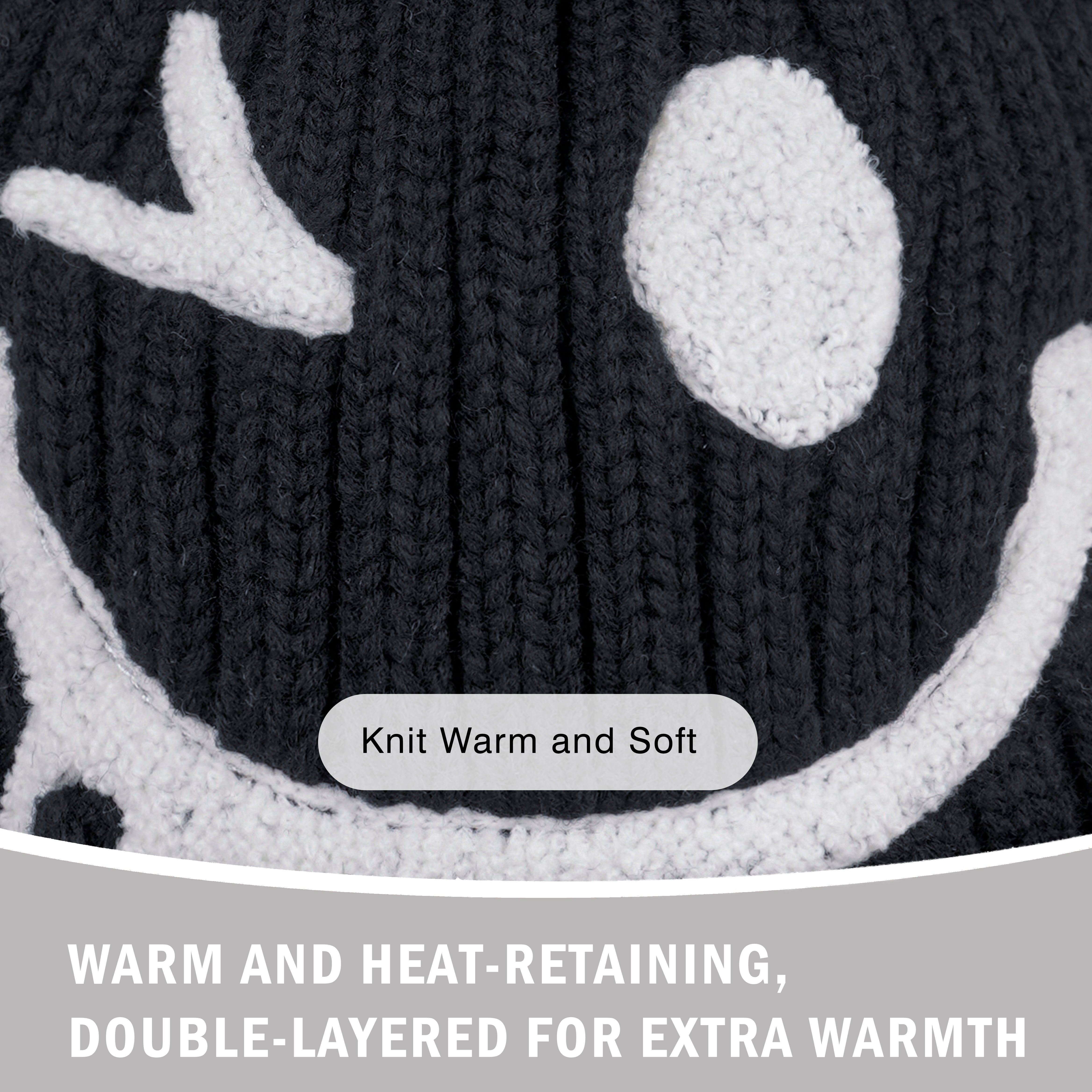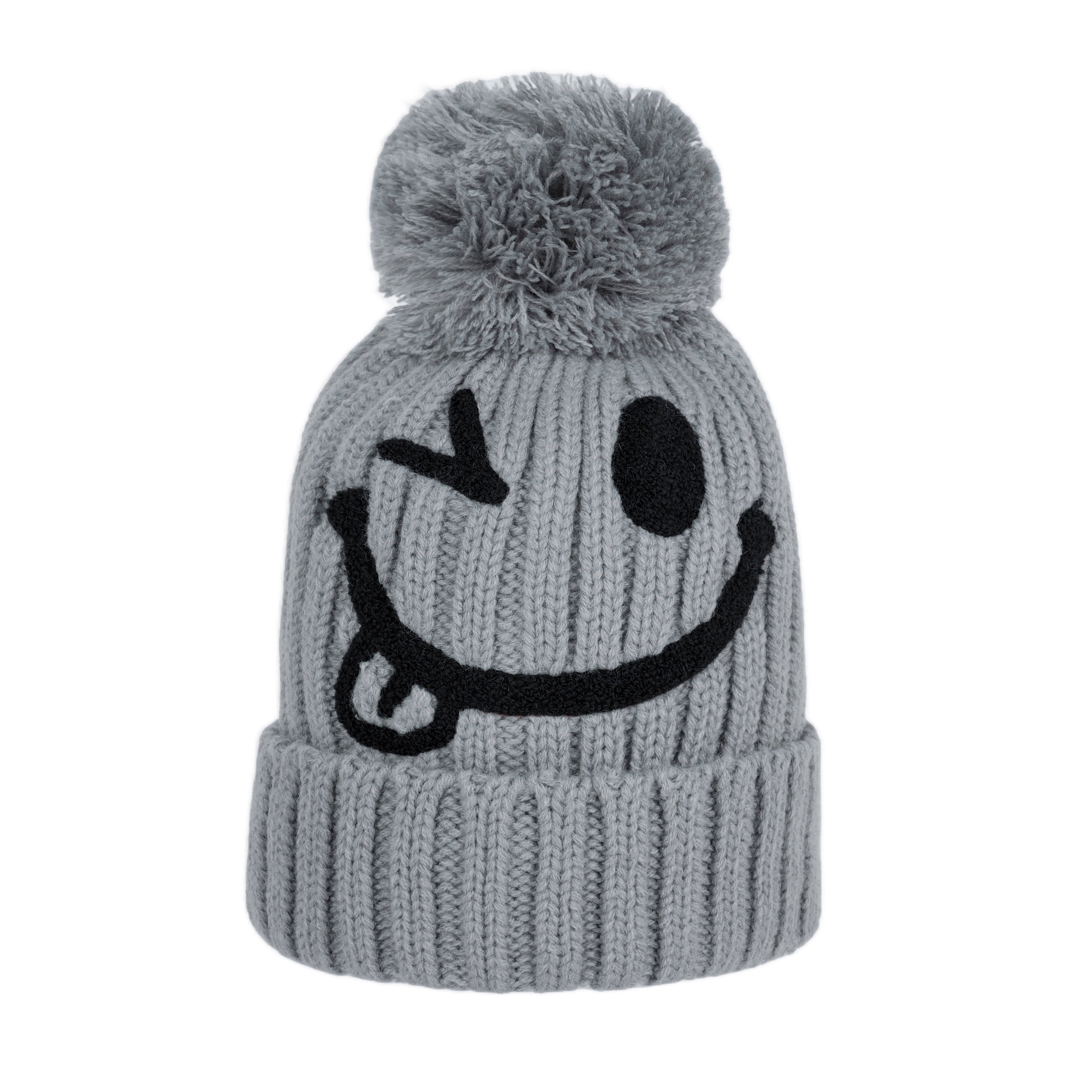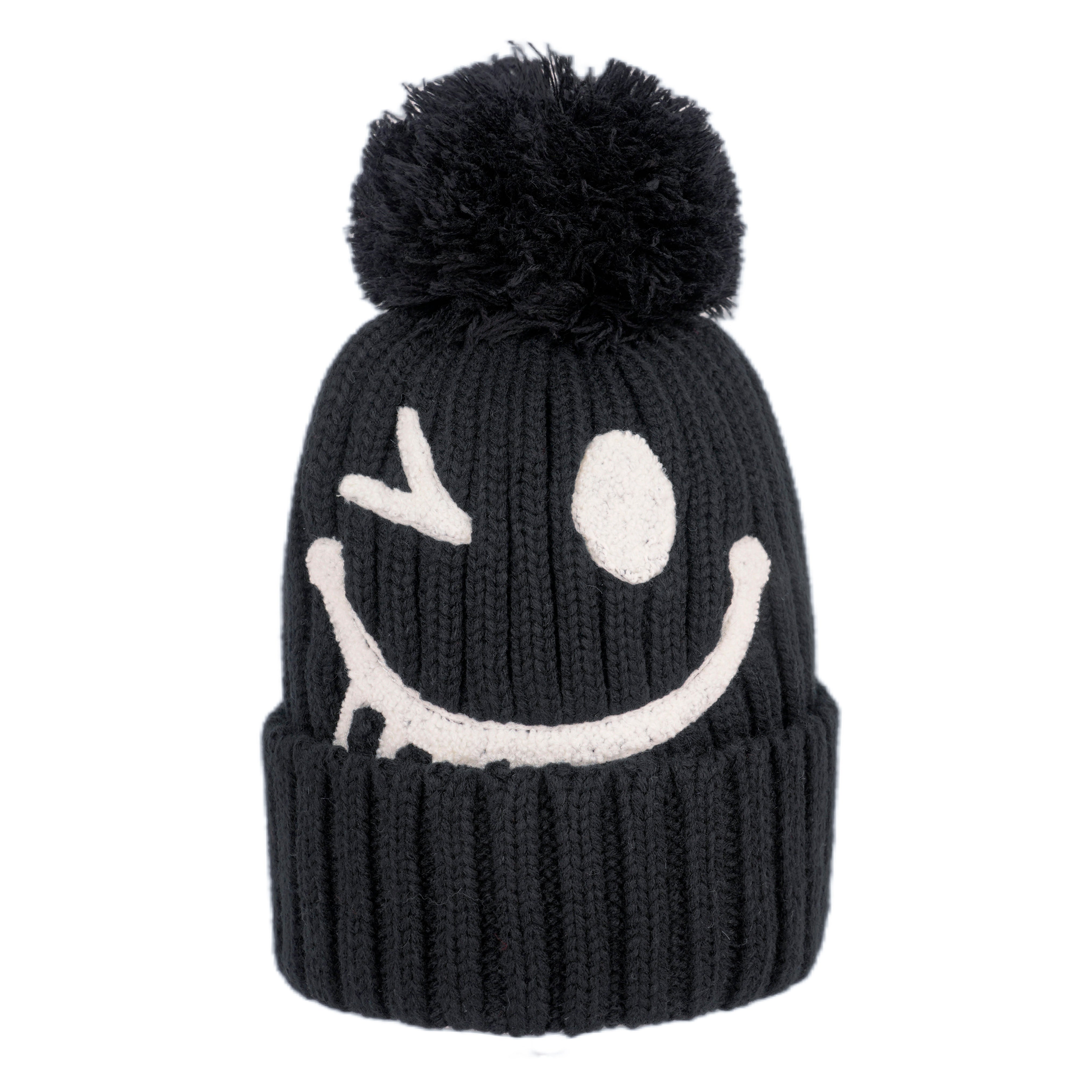 A cozy ribbed knit beanie with a playful smiley face design and fluffy pom detail, adding fun charm to everyday winter outfits.