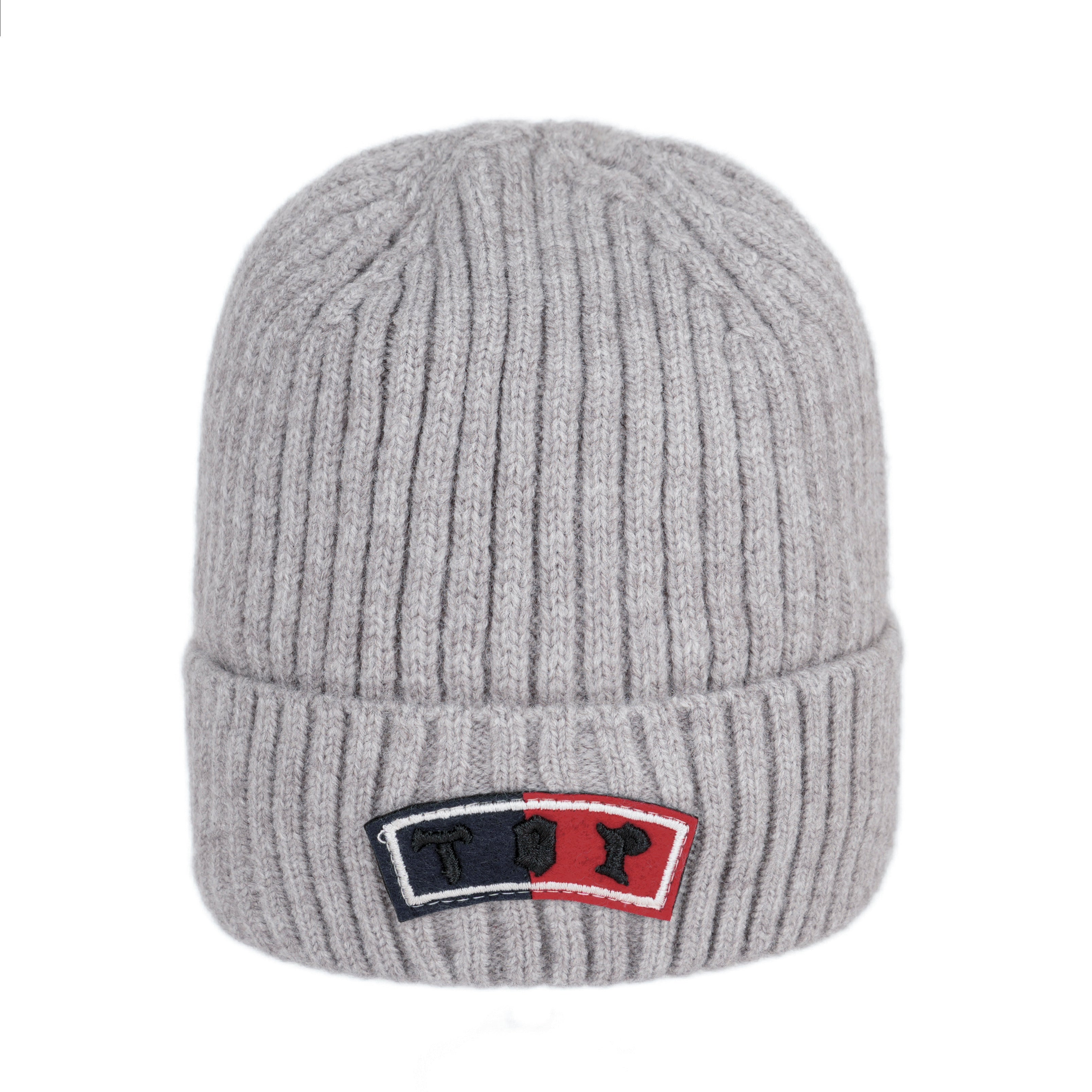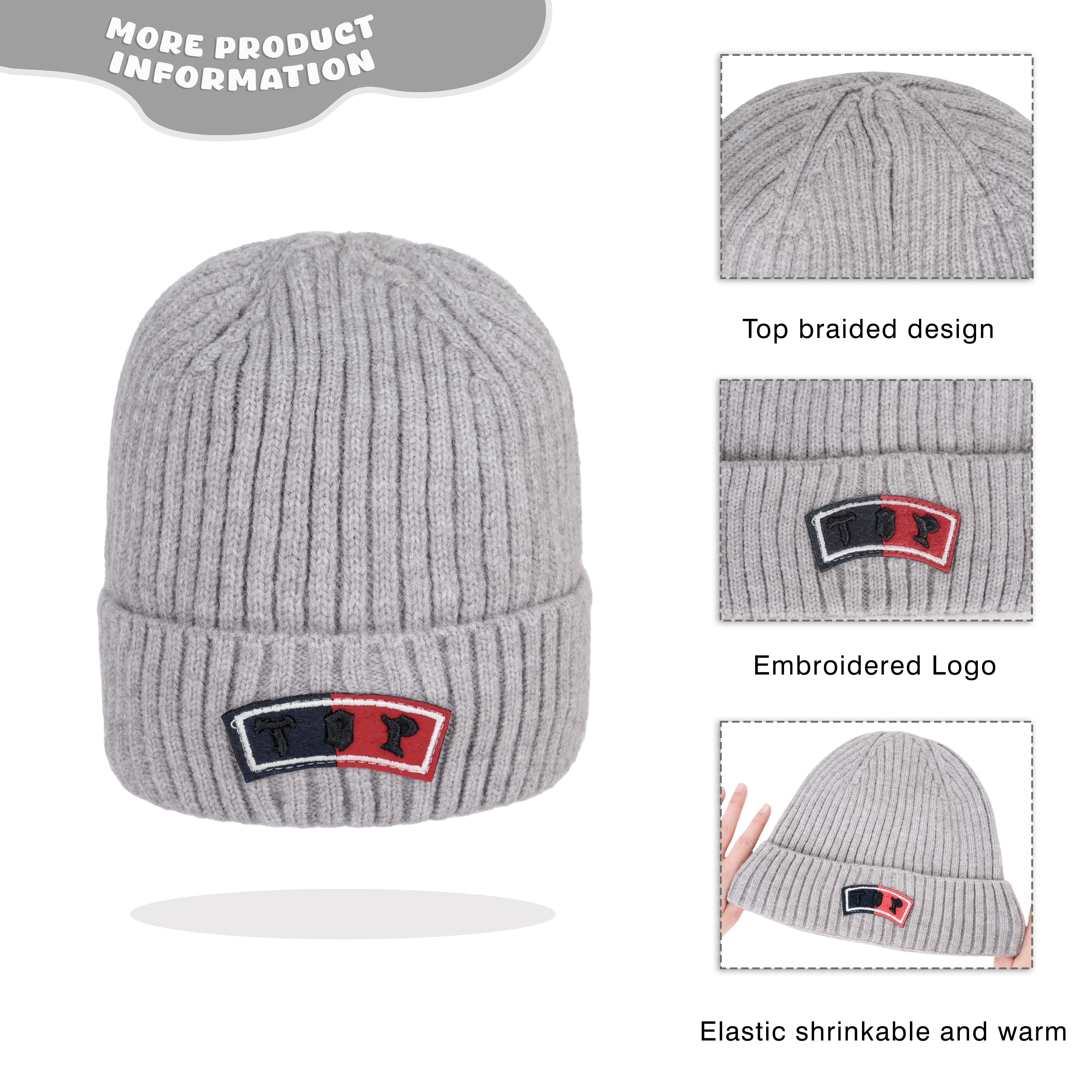 A cozy ribbed knit beanie featuring bold “TOP!” embroidery and a clean color-block accent, perfect for everyday casual wear with a sporty touch.