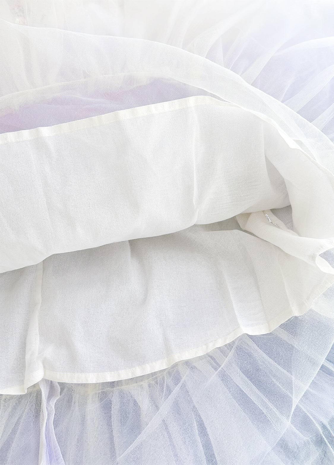 Design: Sleeveless Princess Dress: Featuring colorful mesh fabric and a petal print design.