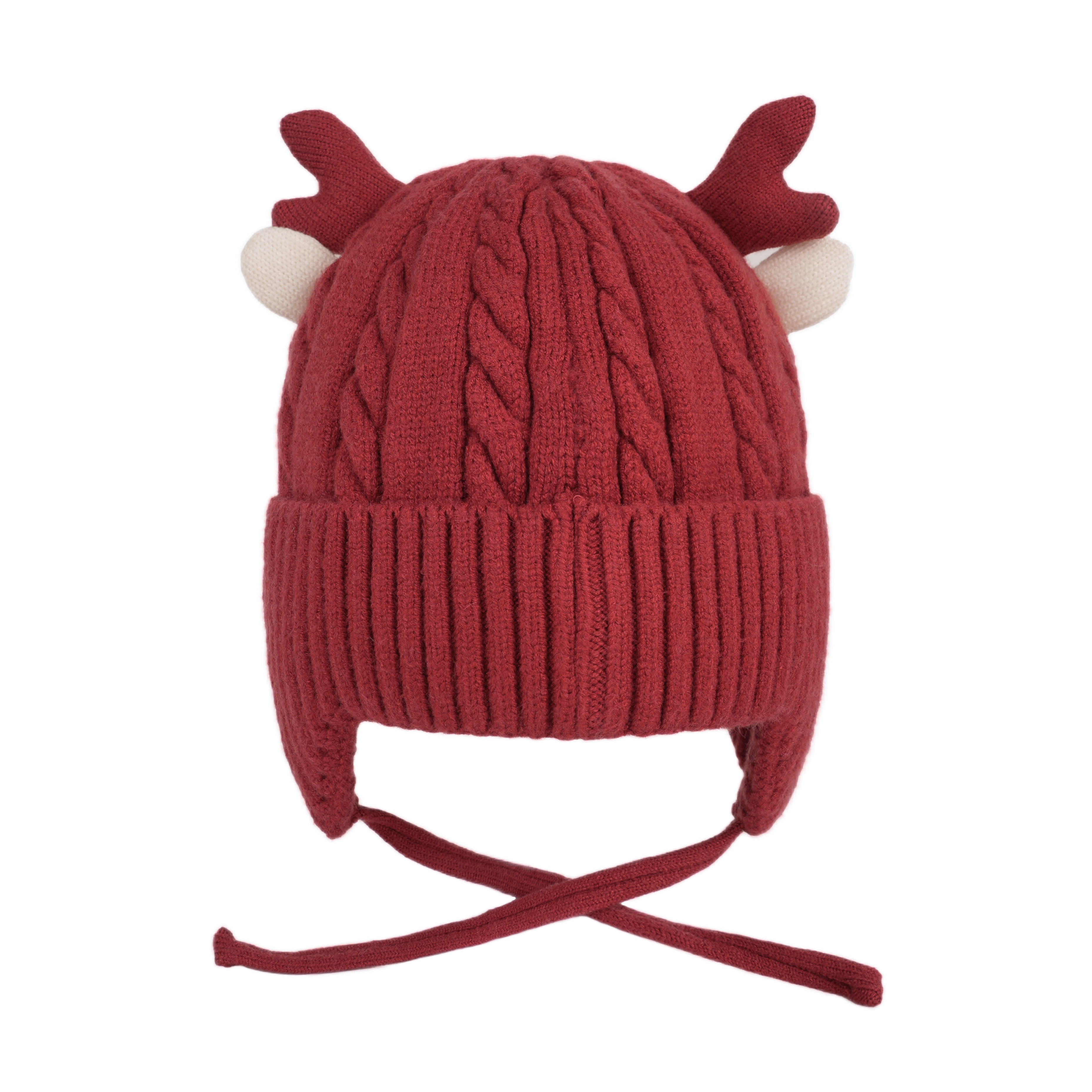 A cozy cable-knit beanie featuring cute reindeer antlers and secure earflaps, designed to keep little ones warm with a festive touch.