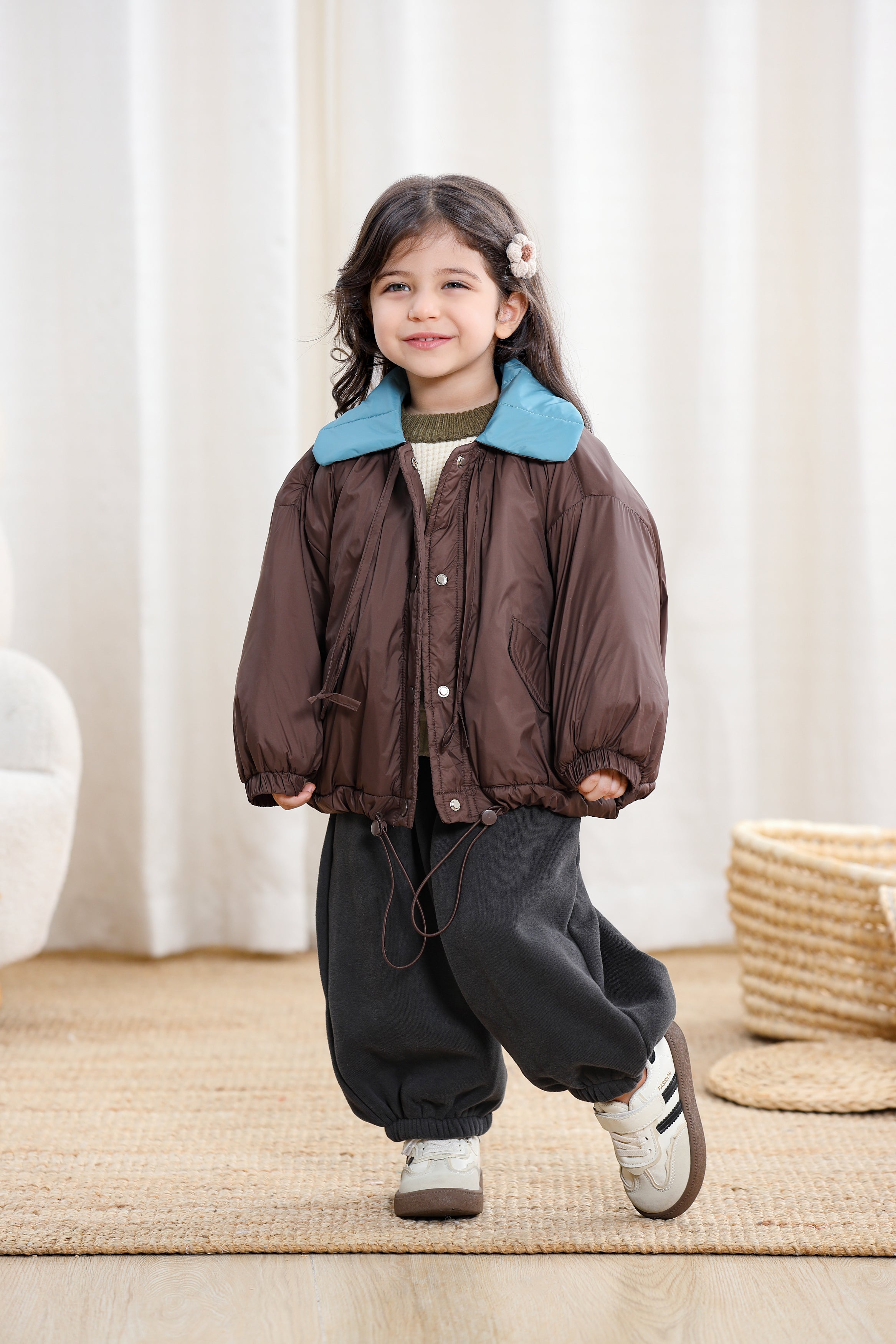 A stylish and cozy puffer jacket designed to keep little ones warm during chilly days. Featuring a trendy colorblock design with a contrast collar, this jacket combines comfort and fashion effortlessly. The snap-button front and elastic cuffs provide extra warmth, while the adjustable drawstring hem ensures a snug fit. Perfect for everyday outdoor adventures.