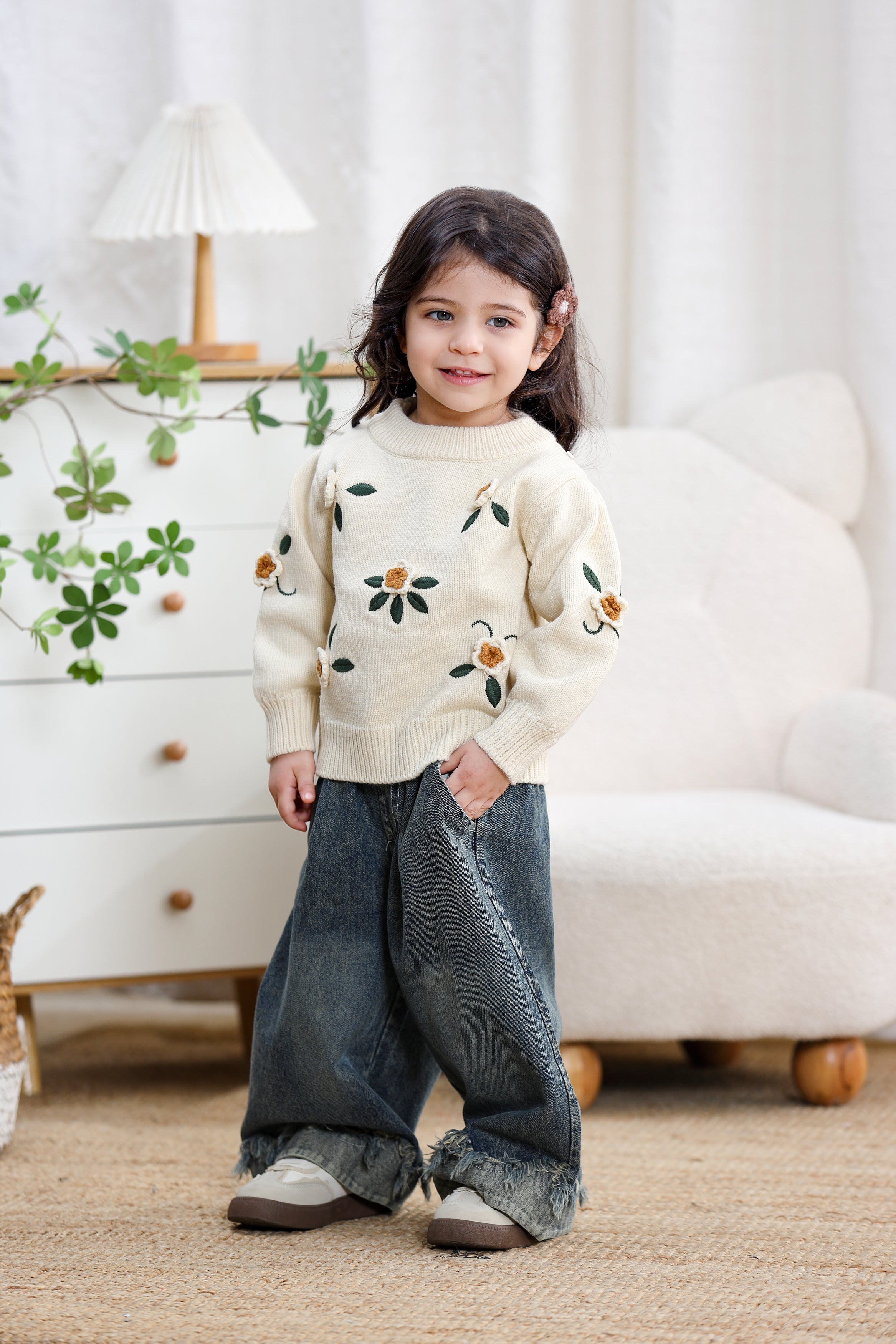 Design: 3D floral appliqué details with ribbed collar, cuffs, and hem