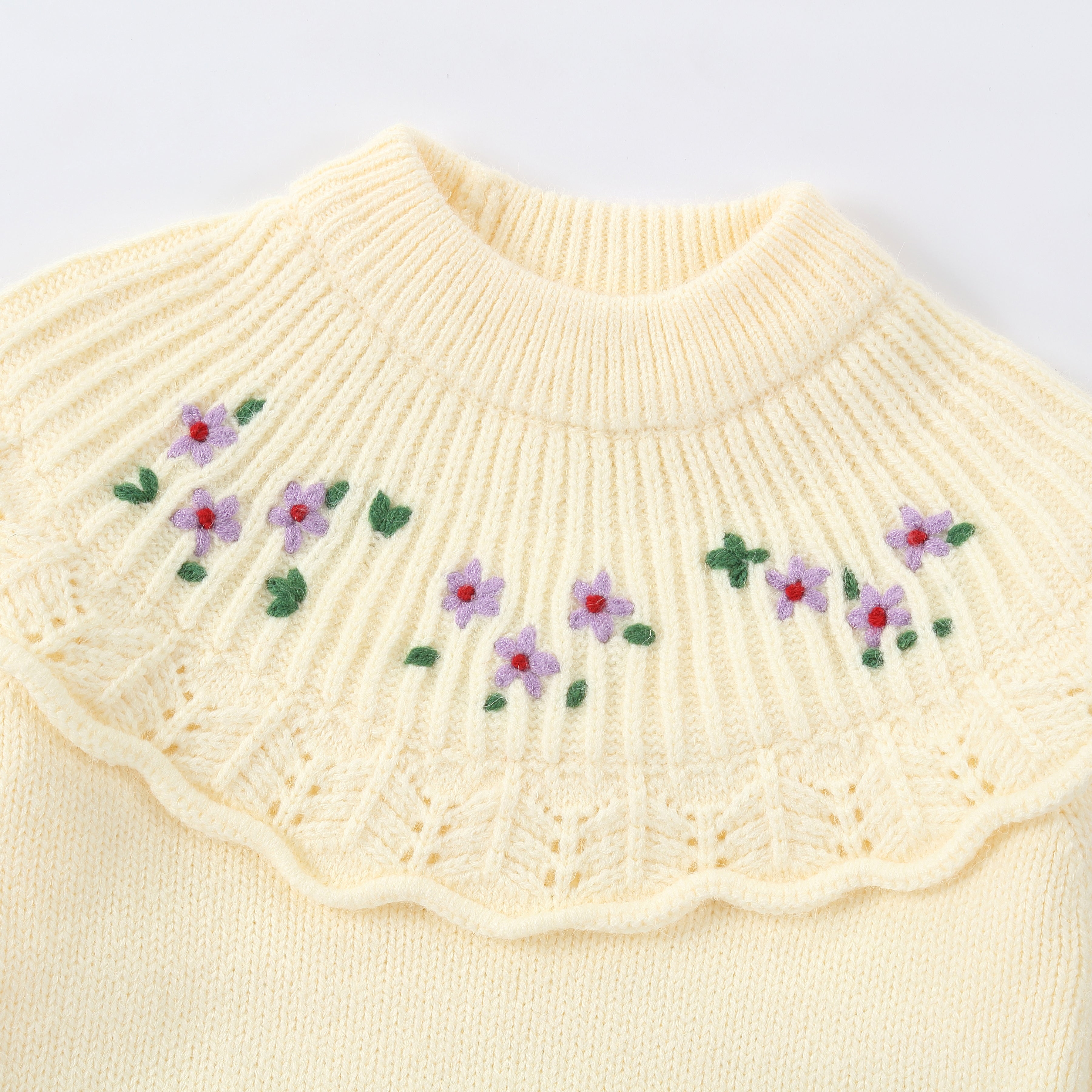 Design: Ruffle collar with floral embroidery, ribbed neckline, cuffs, and hem