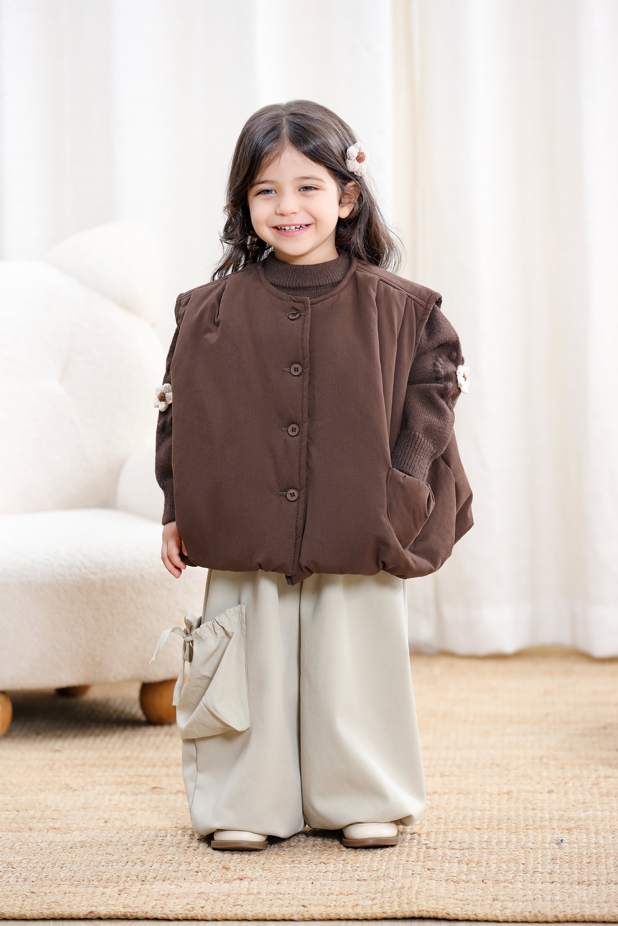 A cozy sleeveless vest designed for lightweight warmth and effortless layering. The softly padded structure provides comfortable insulation without feeling bulky, while the relaxed silhouette makes it easy to wear over sweaters or long-sleeve tops. Finished with front buttons and a practical patch pocket, this versatile piece is perfect for everyday outings and cooler days.